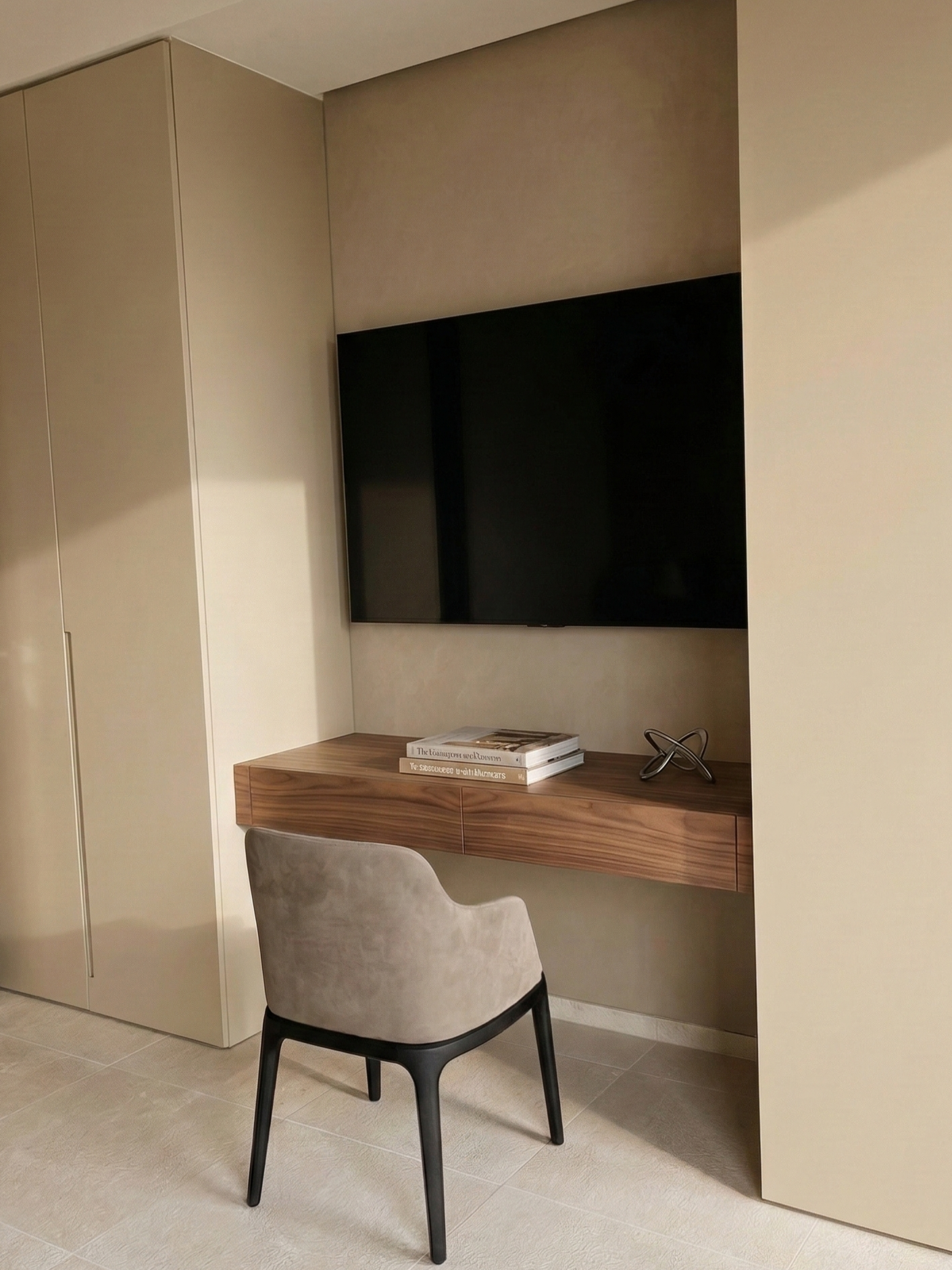 L’interior design si sviluppa attorno a una palette calda e mediterranea: intonaci materici color sabbia, legni naturali e superfici morbide che riflettono la luce del sole creando atmosfere calme e rilassanti. Gli arredi su misura sono stati progettati per integrarsi nell’architettura in modo discreto, disegnando nicchie, contenitori e elementi funzionali che diventano parte stessa dello spazio.
